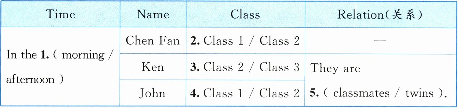 | | John | 4. Class 1 / Class 2 | 5.(classmates / twins). |