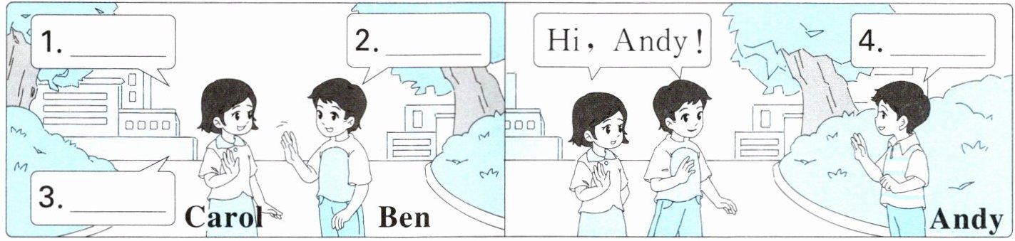 五、见到他人应该如何打招呼呢? 选择合适的内容补全对话,将序号填在横线上。