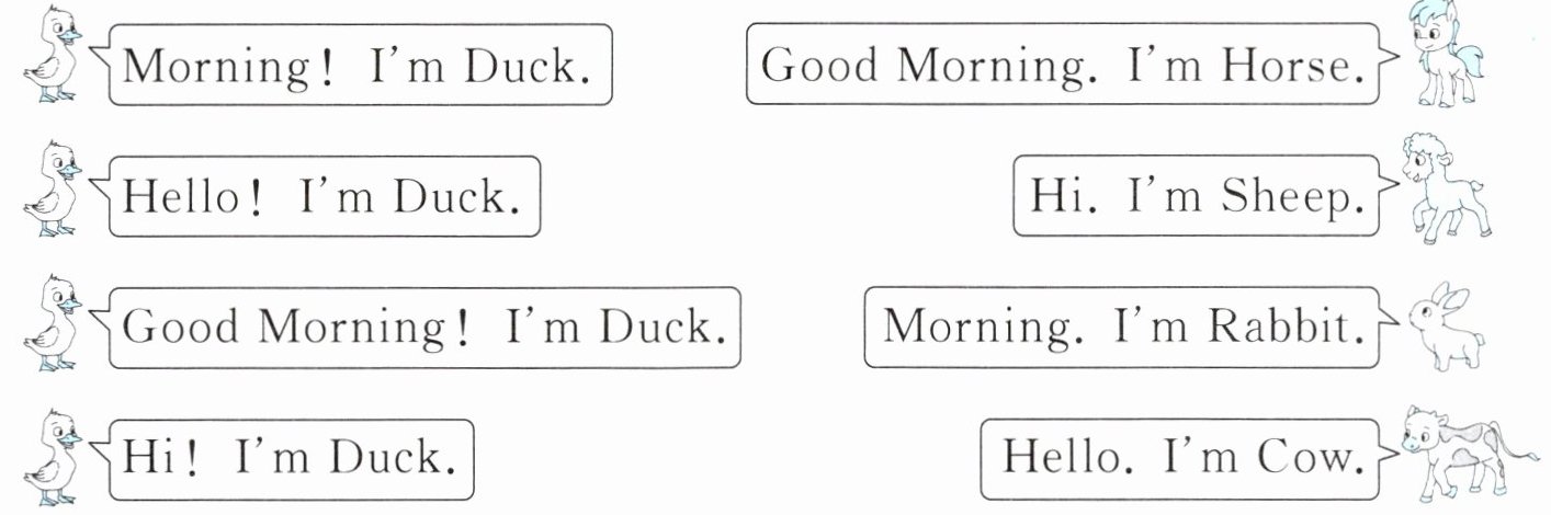 任务二:新朋友们对 Duck 说了什么问候语? 请根据图片进行匹配。