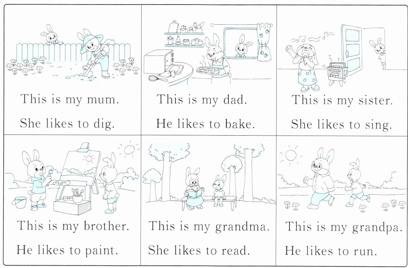 What makes a family? Father, mother and me. "FAMILY" means "Father And Mother, I Love You." Father is great and tall(高的). He plays with me. Mother is nice and beautiful. She hugs(拥抱) me. We love each other. We are happy together.