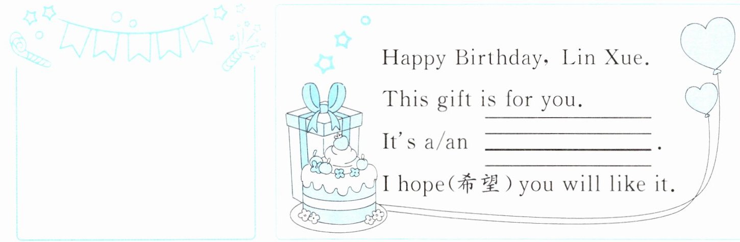 三、作为 Lin Xue 的朋友,你会送给她什么礼物和祝福呢?画出你想送的礼物,并补全贺卡吧!
