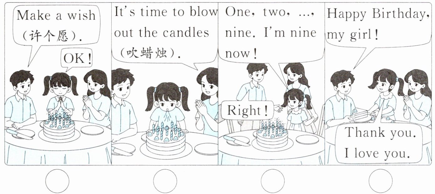 二、到了吃蛋糕的时候啦,Lin Xue 和家人一起坐在桌前。看图并读对话,用数字 1—4 给图片排序。