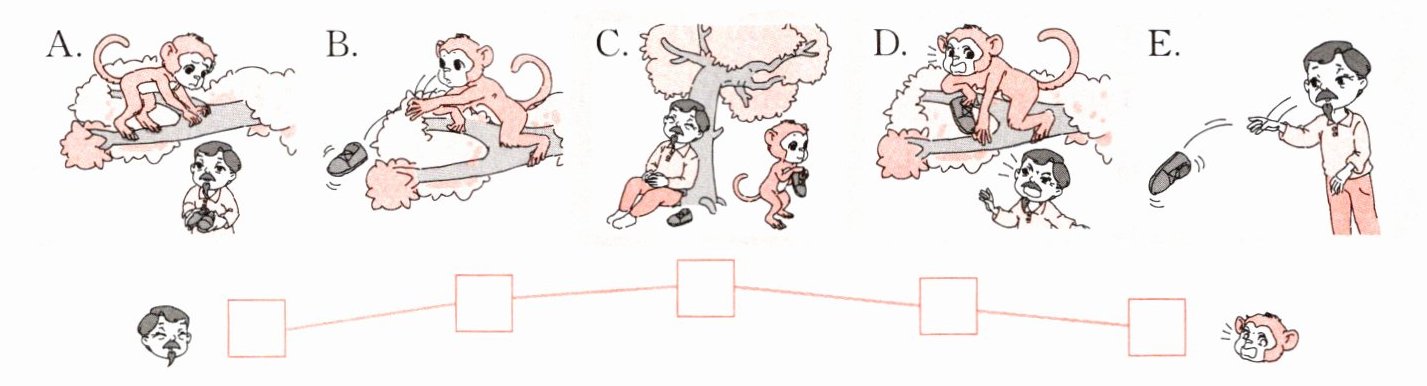 He shouts at the monkey, "Hey! Monkey! Give it back to me!" The monkey shouts too. It's imitating the farmer. The farmer thinks the monkey likes imitating. An idea comes to his mind. He throws the other shoe away. Guess what? Yes! The monkey throws the shoe away too! Now the farmer gets his shoe back. He's very happy.