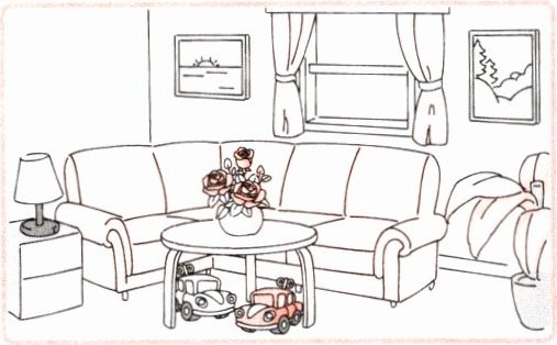 Look! This is my living room. It's big and nice. There's an orange sofa in the living room. Beside the sofa,there's a table. On the table,there is a vase. Under the table,there are two toy cars. One is red and the other is white. I like the toy cars. There's a window in the wall. It's between the pictures. The pictures are very beautiful. I like my living room.