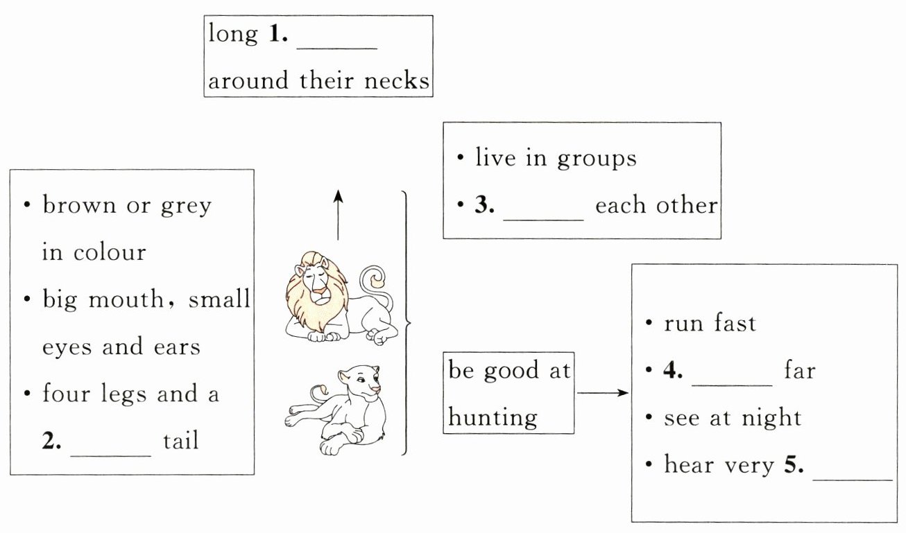 Lions live in groups (组). There are 3 to 40 lions in a group. There are mums, aunts, sisters, babies and one or two males. They help each other. Lions like eating meat. They can run very fast and jump far. And they can see at night and can hear very well. So they are good at hunting.