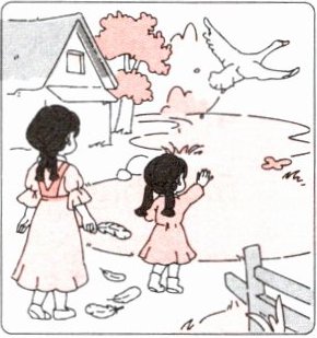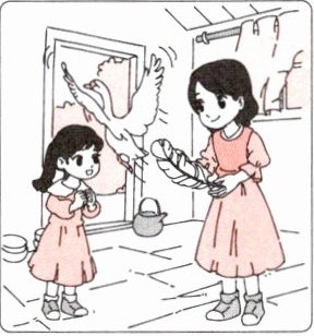 The swan is sad to see the woman and her daughter live a hard life. It wants to help them, so it leaves(留下)them one golden feather each day.1