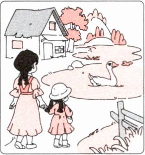 There's a beautiful swan with golden feathers. It lives in a lake. There's a woman. She and her daughter live in a small house beside the lake. They are poor.