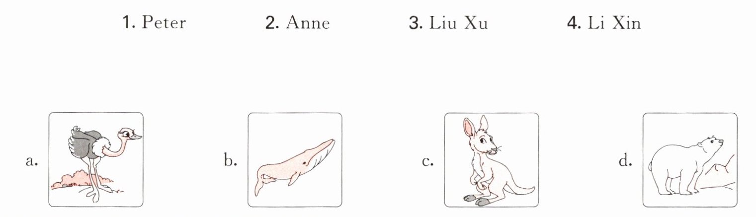 二、同学们在聊自己的动物朋友。听录音,将人名与其动物朋友图片连线。