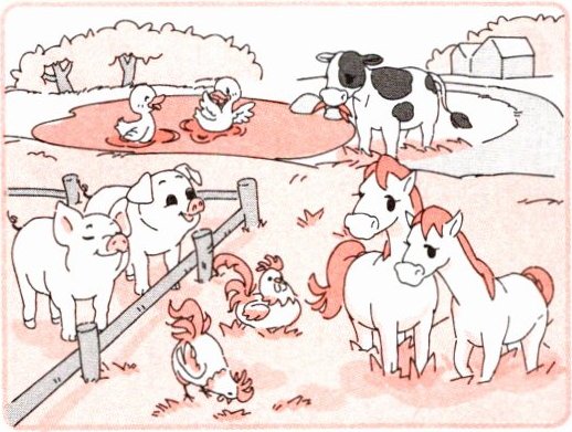 There is a big farm. Look! There are two pigs. They have big bodies. They like food. There are also two ducks. They have wings. They can swim in the pond. Beside the pond, there's a cow. It's black and white. It gives me much milk. My good friends are two big horses. They have four strong legs. They can run very fast. I like the farm very much.