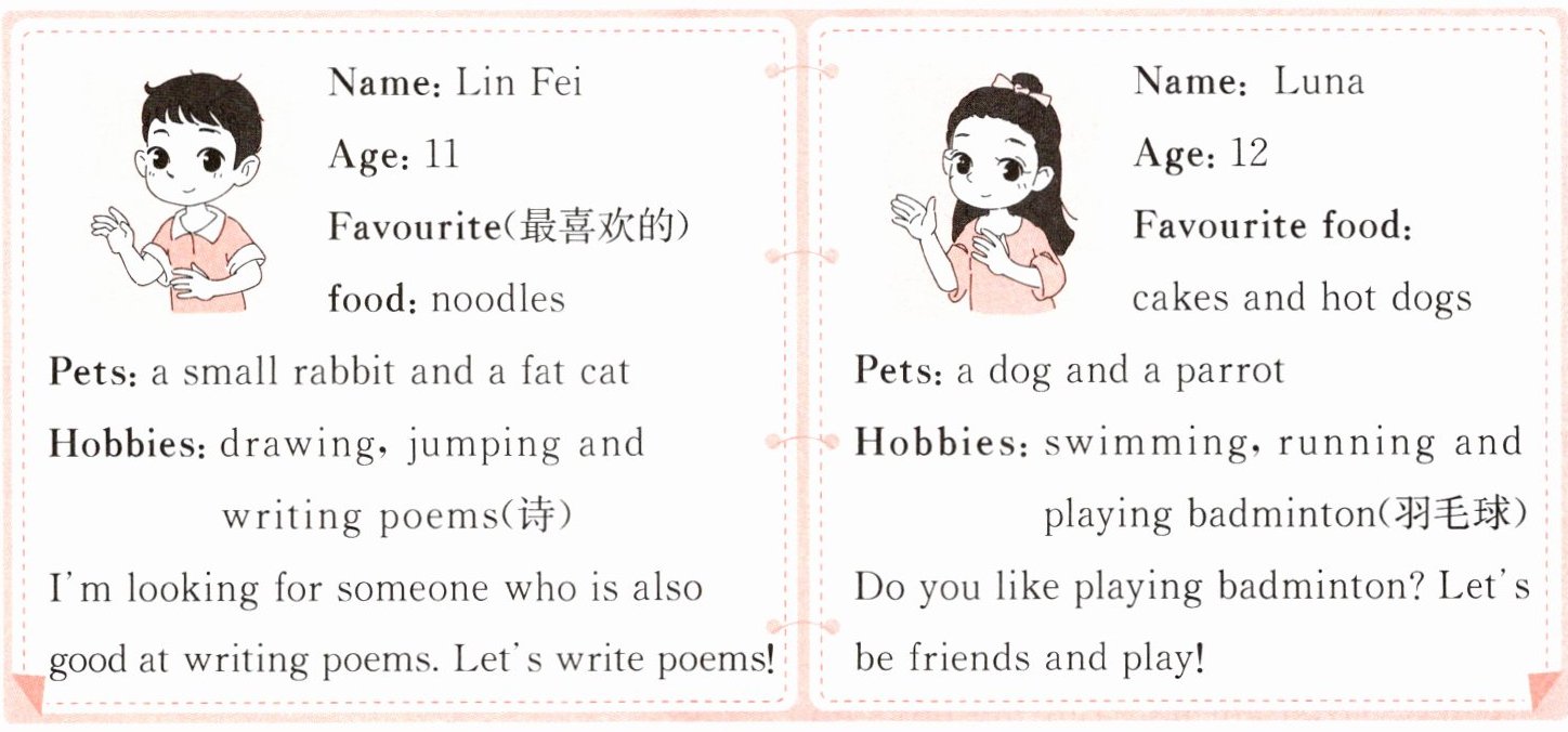 六、阅读两位小朋友的信息卡,判断下列句子正(T)误(F)。