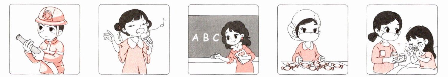 1. long hair 2. swimming 3. factory worker 4. basketball player