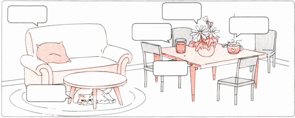沙发:1 桌子:2 花:3 一杯水:4 一杯热茶:5 猫:6