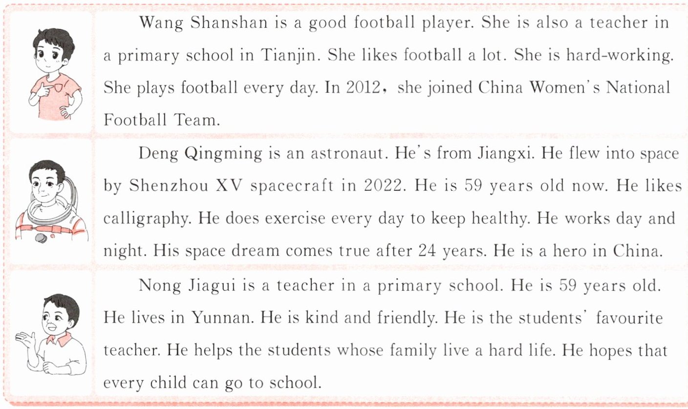 Deng Qingming is an astronaut. He's from Jiangxi. He flew into space by Shenzhou XV spacecraft in 2022. He is 59 years old now. He likes calligraphy. He does exercise every day to keep healthy. He works day and night. His space dream comes true after 24 years. He is a hero in China.