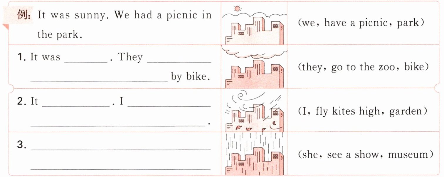 1. cloudy;went to the zoo 2. was windy;flew kites high in the garden 3. It was rainy. She saw a show in the museum.