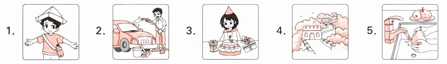 1. Saturday 2. at home 3. picked mangoes 4. caught fish 5. parrot show