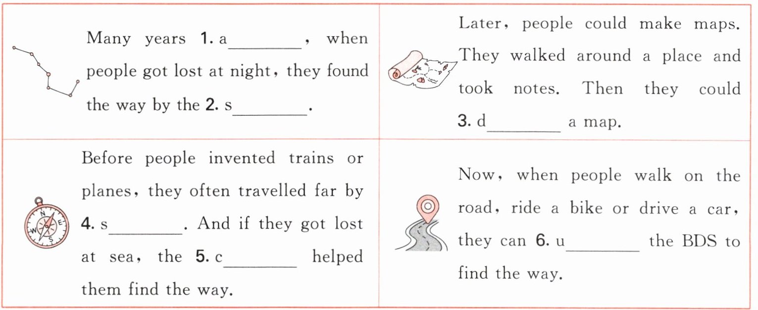 四、不同时代的人们有着不同的导航方法。根据图片和首字母提示补全段落。