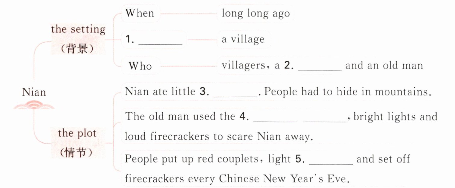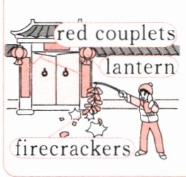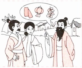 One year, an old man came to the village and said, "I know how to scare Nian away! He's afraid of the colour red, bright(明亮的) lights and loud noise." That night, when Nian came to the village, he saw red everywhere, heard loud bangs and ran away.