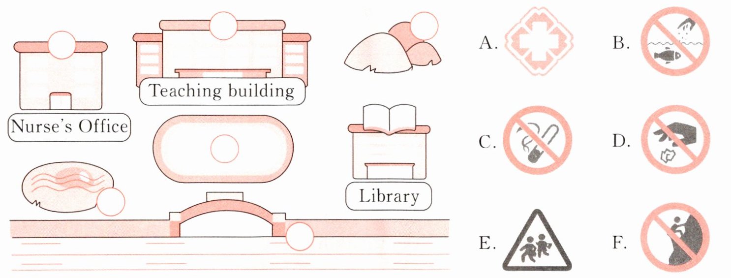 四、听录音,根据听到的内容,给校园地图上的各场所选择合适的标识。