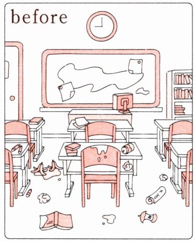 ? before, our, clean, classroom, wasB: No, it wasn't. It was messy.