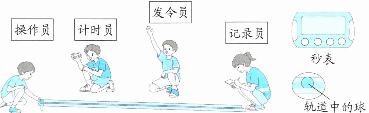 ①将1号小球放在轨道的起点处,发令员说“跑”的同时,操作员自然放手,计时员按下秒表计时。小球跑到终点,发令员说“停”的同时,计时员暂停秒表,重复测量三次,记录员记录运动时间。