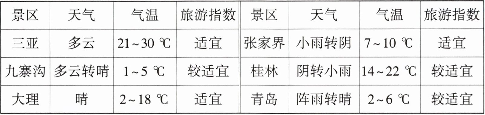 4. 时事热点 小科查询到热门景点的天气情况如表所示。请根据查询的信息回答问题。
