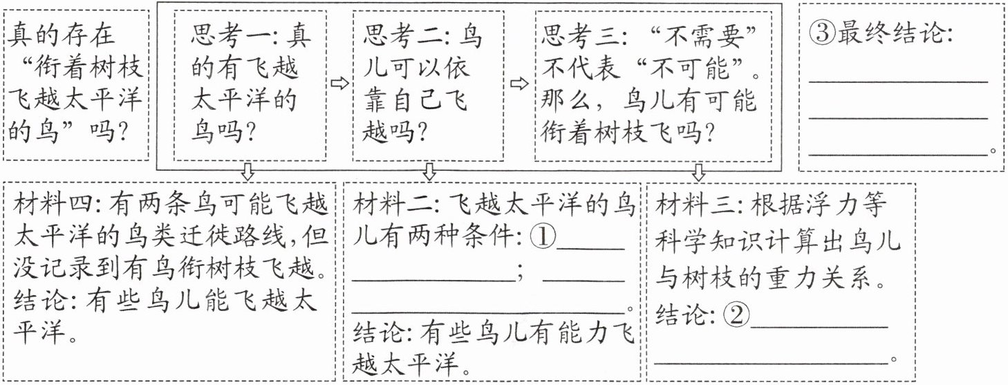 - 思考二:鸟儿可以依靠自己飞越吗$?\n$材料二:飞越太平洋的鸟儿有两种条件:①________________;________________。$\n$结论:有些鸟儿有能力飞越太平洋。