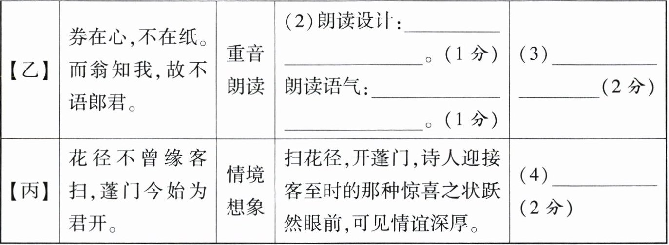 |【丙】|花径不曾缘客扫,蓬门今始为君开。|情境想象|扫花径,开蓬门,诗人迎接客至时的那种惊喜之状跃然眼前,可见情谊深厚。|(4)______(2 分)|