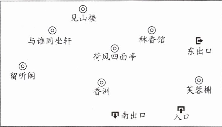 1. 小苏和同学到拙政园参加“为荷而来”主题摄影活动,准备打卡园内几处赏荷景点。请结合游客小册子,为他们设计一条合理的赏荷游览路线,在示意图上用“→”标示出游览顺序,向他们描述路线并说明设计理由。(4 分)