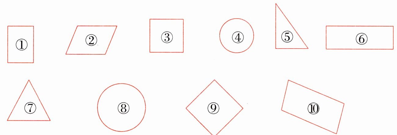 长方形: (① ⑥) 正方形: (③ ⑨)圆: (④ ⑧) 三角形: (⑤ ⑦)平行四边形: (② ⑩)