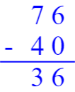 $ \begin{array}{r} 76 \\ - 40 \\ \hline \end{array} $