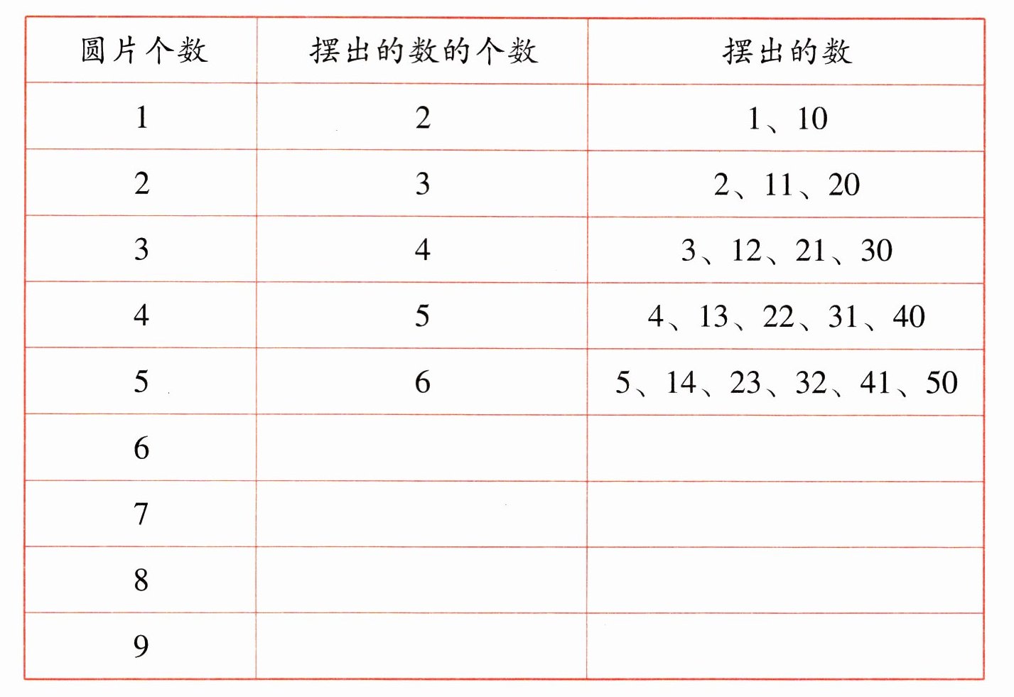 【解析】:观察表格中圆片个数与摆出的数的个数的关系,1个圆片摆出2个数,2个圆片摆出3个数,3个圆片摆出4个数,可发现摆出的数的个数比圆片个数多1。再看摆出的数,以圆片个数为5为例,数为5、14、23、32、41、50,这些数的个位和十位数字之和都是5,即等于圆片个数。按照此规律,6个圆片时,摆出的数的个数为6+1=7个,数的个位和十位数字之和为6,依次为6、15、24、33、42、51、60;同理,7个圆片摆出8个数,为7、16、25、34、43、52、61、70;8个圆片摆出9个数,为8、17、26、35、44、53、62、71、80;9个圆片摆出10个数,为9、18、27、36、45、54、63、72、81、90。