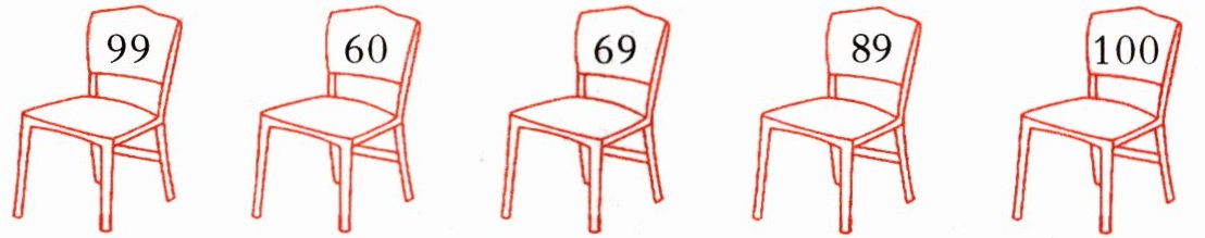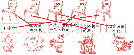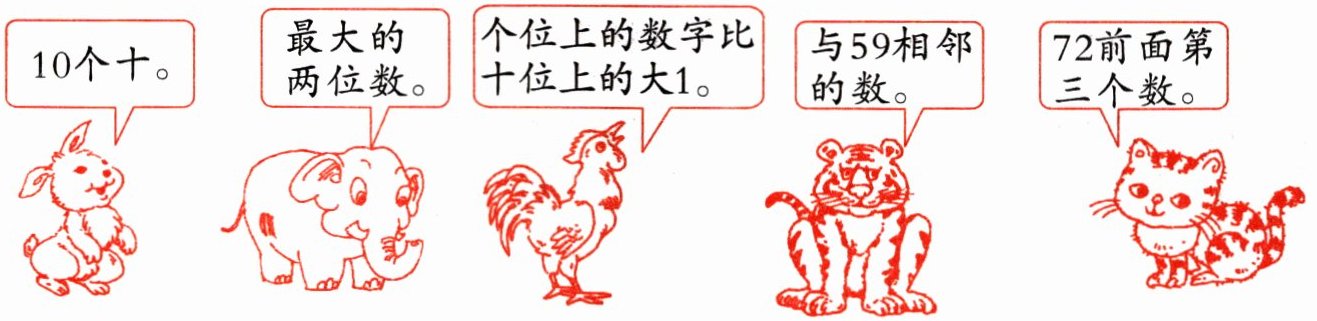 【答案】:10个十连100;最大的两位数连99;个位上的数字比十位上的大1连89;与59相邻的数连60;72前面第三个数连69。