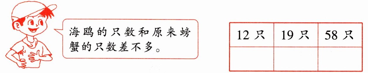 因为原来螃蟹有$20$只,$12$与$20$相差$20 - 12=8$;$19$与$20$相差$20 - 19 = 1$;$58$与$20$相差$58 - 20=38$。$19$和$20$最接近,所以在$19$只下面画“√”。