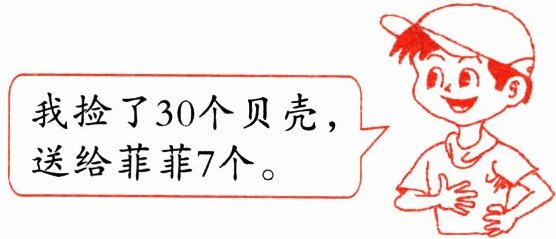 解:已知毛毛捡了$30$个贝壳,送给菲菲$7$个,求剩下的贝壳数,用减法计算,可列式为$30 - 7$。