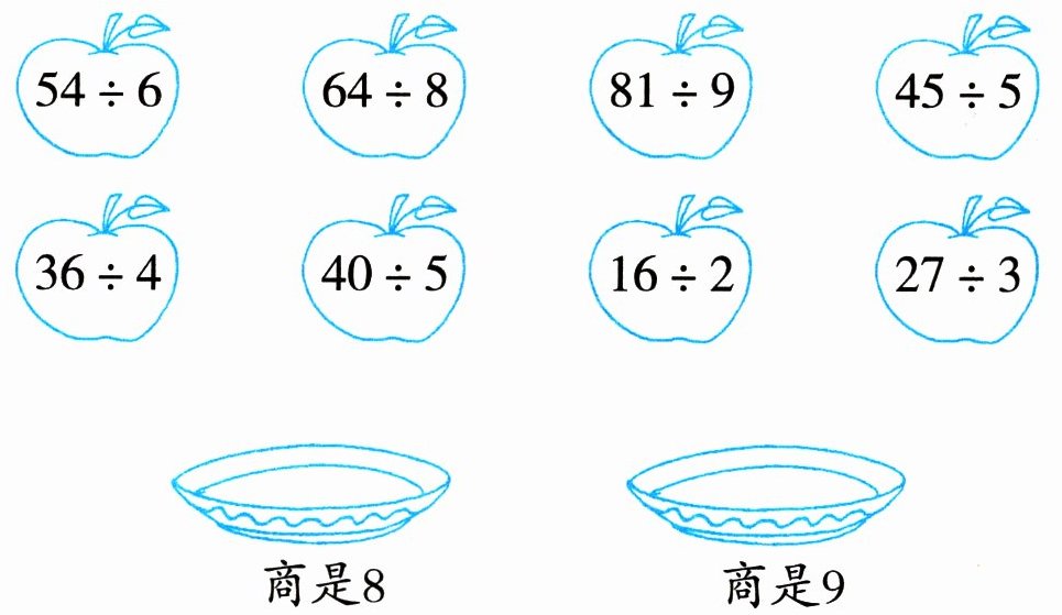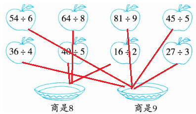 然后将商是8的算式连到“商是8”的盘子,商是9的算式连到“商是9”的盘子。