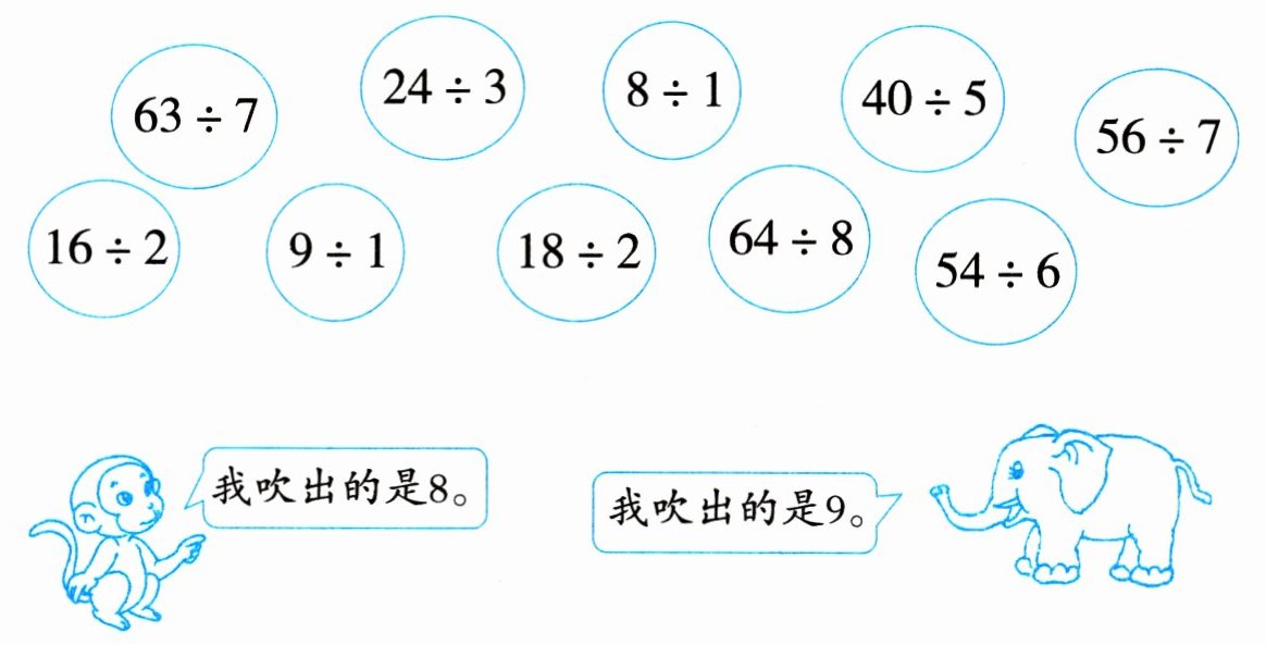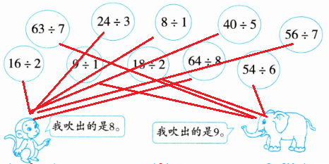 【答案】:(将结果为8的算式$24÷3$、$8÷1$、$40÷5$、$56÷7$、$16÷2$、$64÷8$与猴子相连;将结果为9的算式$63÷7$、$9÷1$、$18÷2$、$54÷6$与大象相连)