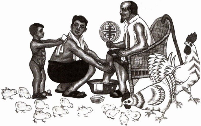 炎炎夏季,酷暑难耐。傍晚,爷爷乐呵呵地坐在藤椅上,一只脚放在水盆中,爸爸正汗流浃背地给爷爷洗脚,这时小儿子跑过来,拿来一条白毛巾给爸爸擦背上的汗珠。这是一幅多么和谐温馨的画面啊!