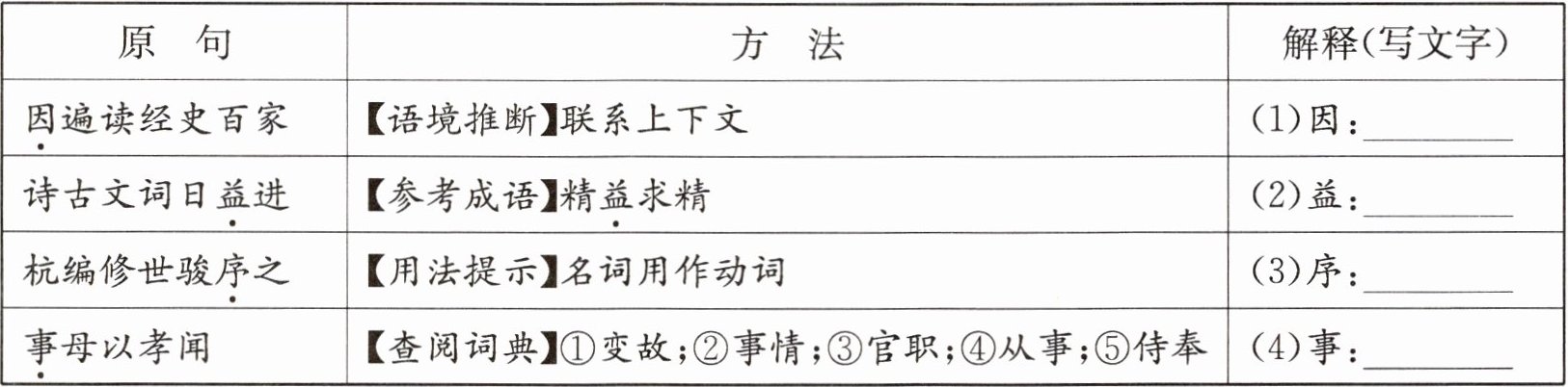 遍读经史百家|【语境推断】联系上下文|(1)因:______||诗古文词日