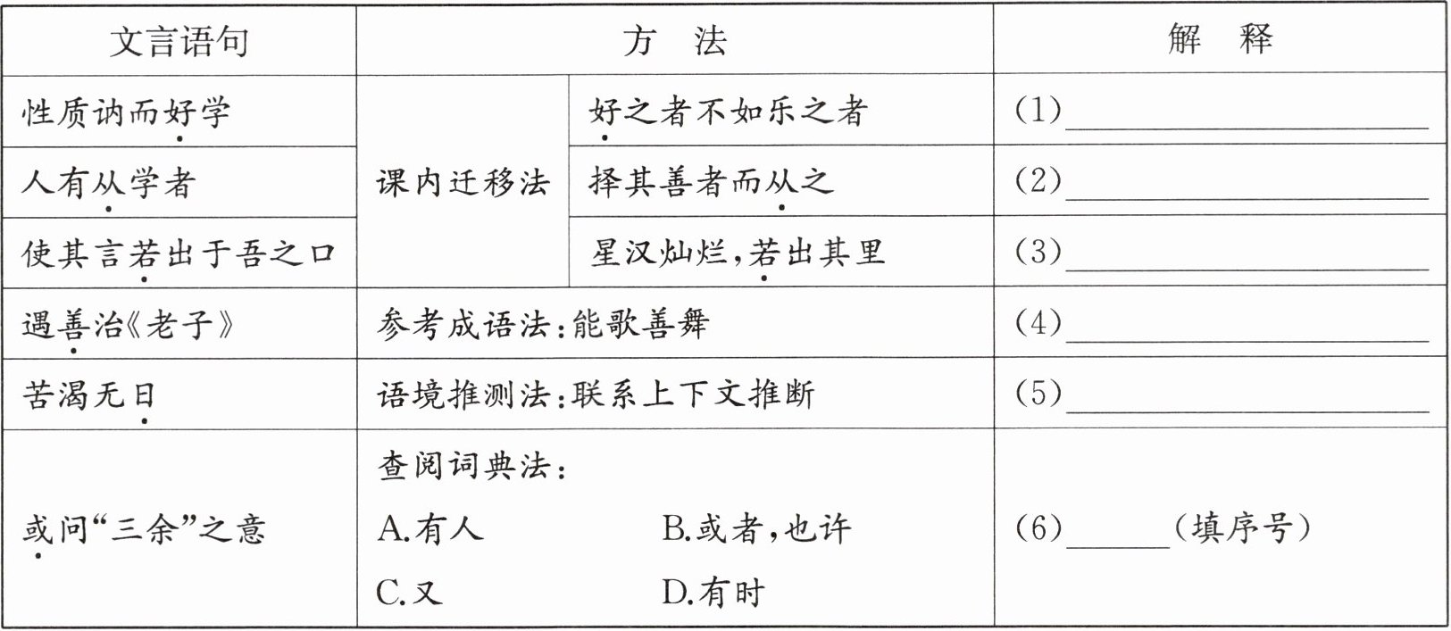 治《老子》|参考成语法:能歌善舞|(4)______||苦渴无日|语境推测法:联系上下文推断|(5)______|