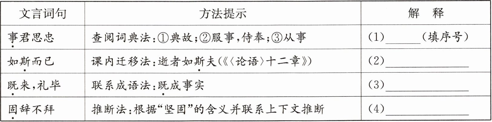 |固辞不拜|推断法:根据“坚固”的含义并联系上下文推断|(4)______|