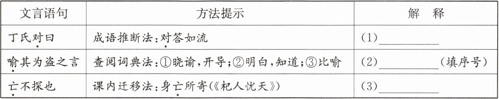 其为盗之言|查阅词典法:①晓谕,开导;②明白,知道;③比喻|(2)______(填序号)||亡不探也|课内迁移法:身亡所寄(《杞人忧天》)|(3)______|