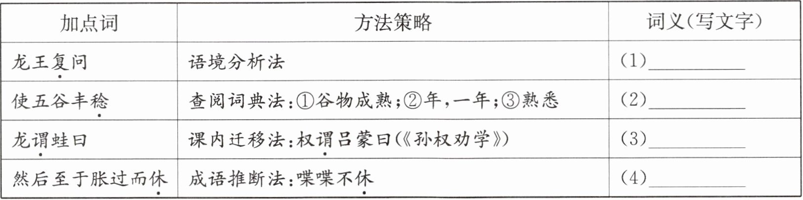【据题精析】(1)运用语境分析法,根据上文“蛙问龙王曰”可知,青蛙已经问过龙王这个问题了。故“龙王复问”的意思是“龙王又问”,因此“复”是“又,再”的意思。(2)运用查阅词典法,将题干所给义项依次代入句中,当“稔”的意思是“谷物成熟”时,句子可译为“让谷物成熟丰收”,语句通顺,表意清晰。(3)联系《孙权劝学》中的“权谓吕蒙曰”(孙权对吕蒙说)可推知,“谓”是“告诉,对……说”的意思。(4)联系成语“喋喋不休”(唠唠叨叨地说个不停)可推知,“休”是“停止”的意思。
