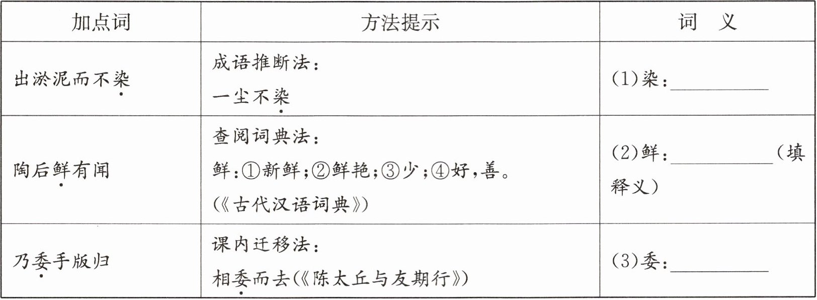 有闻|查阅词典法:鲜:①新鲜;②鲜艳;③少;④好,善。(《古代汉语词典》)|(2)鲜:______(填释义)||乃