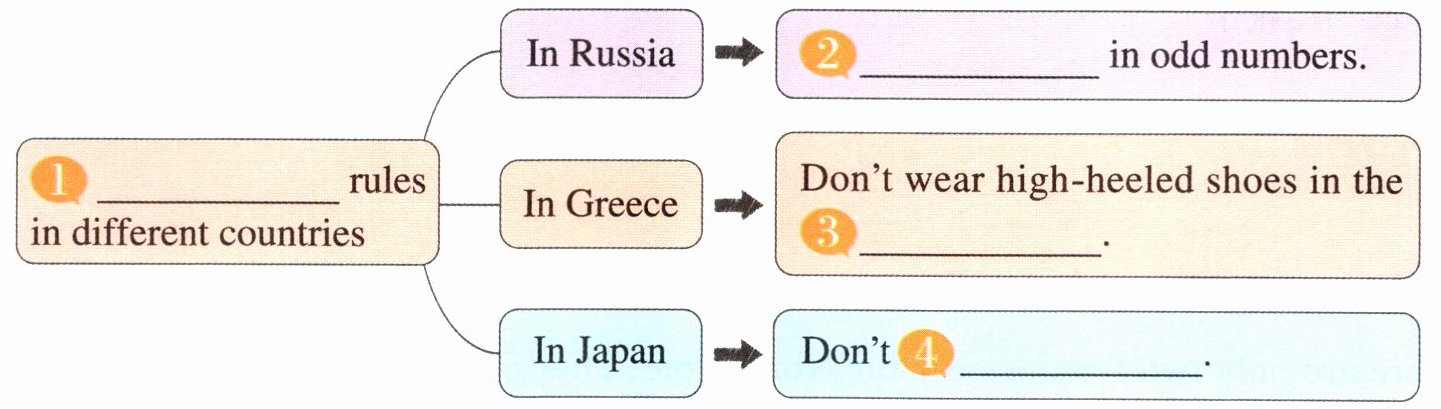 一、1. Different/Interesting 2. Give flowers 3. places of interest 4. give tips