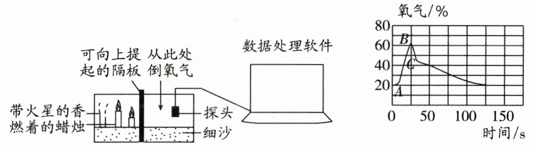 13. (2024·成都期末)某实验小组为探究氧气的性质,利用传感器绘制氧气浓度与时间的曲线图。曲线在 $ AB $ 段时,隔板未提起;曲线在 $ BC $ 段时,隔板稍微向上提起。通过该实验不能获取的信息是 (
