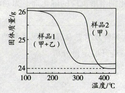 7. 分别加热等质量的两种样品,固体质量随温度变化的曲线如下图所示。样品 1 反应前后各物质的质量如下表。分离出样品 1 反应后的固体乙,与 24.0 g 甲混合并加热,固体质量变化曲线与样品 1 的相同。下列说法正确的是 (