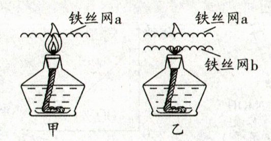 (1)“火焰分割”。先将加热至红热的铁丝网 a 平伸到火焰上部,如图甲所示;再将常温的铁丝网 b 平伸到火焰下部,两张铁丝网中间的火焰熄灭,如图乙所示。