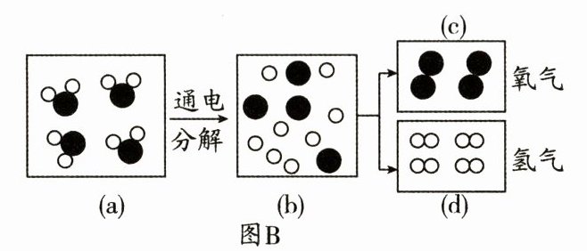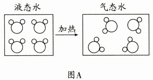18. (6分)如图A是液态水加热变成气态水蒸气的示意图,图B是水通电分解生成氢气和氧气的示意图。请据图回答下列问题。