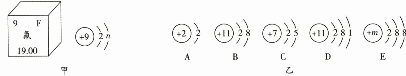 (填字母)。(2)如图甲是氟元素的部分信息,如图乙是A~E五种微观粒子的结构示意图。