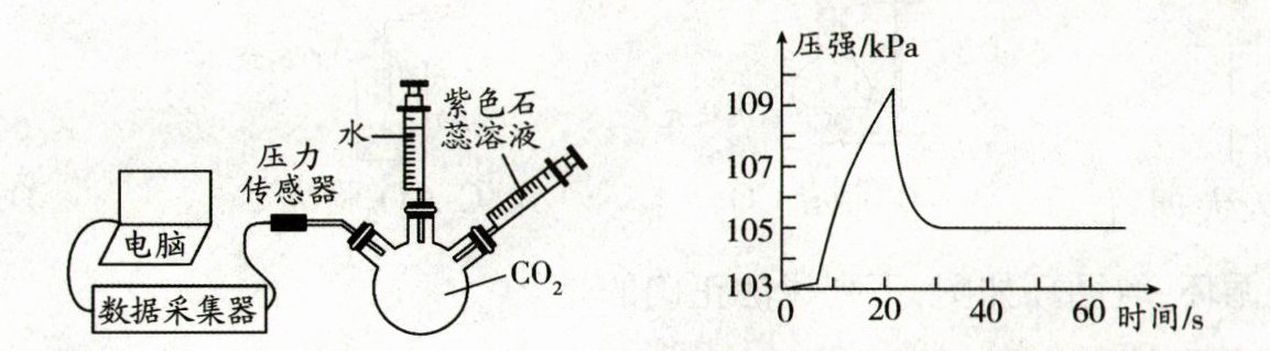 。在三颈烧瓶中收集满 $ {CO_{2}} $ 气体后,设置好数据采集参数。点击数据采集按钮,将水注入,观察压强曲线变化(如图所示)。(7)曲线不再变化后,停止收集数据,将紫色石蕊溶液注入烧瓶中,观察到